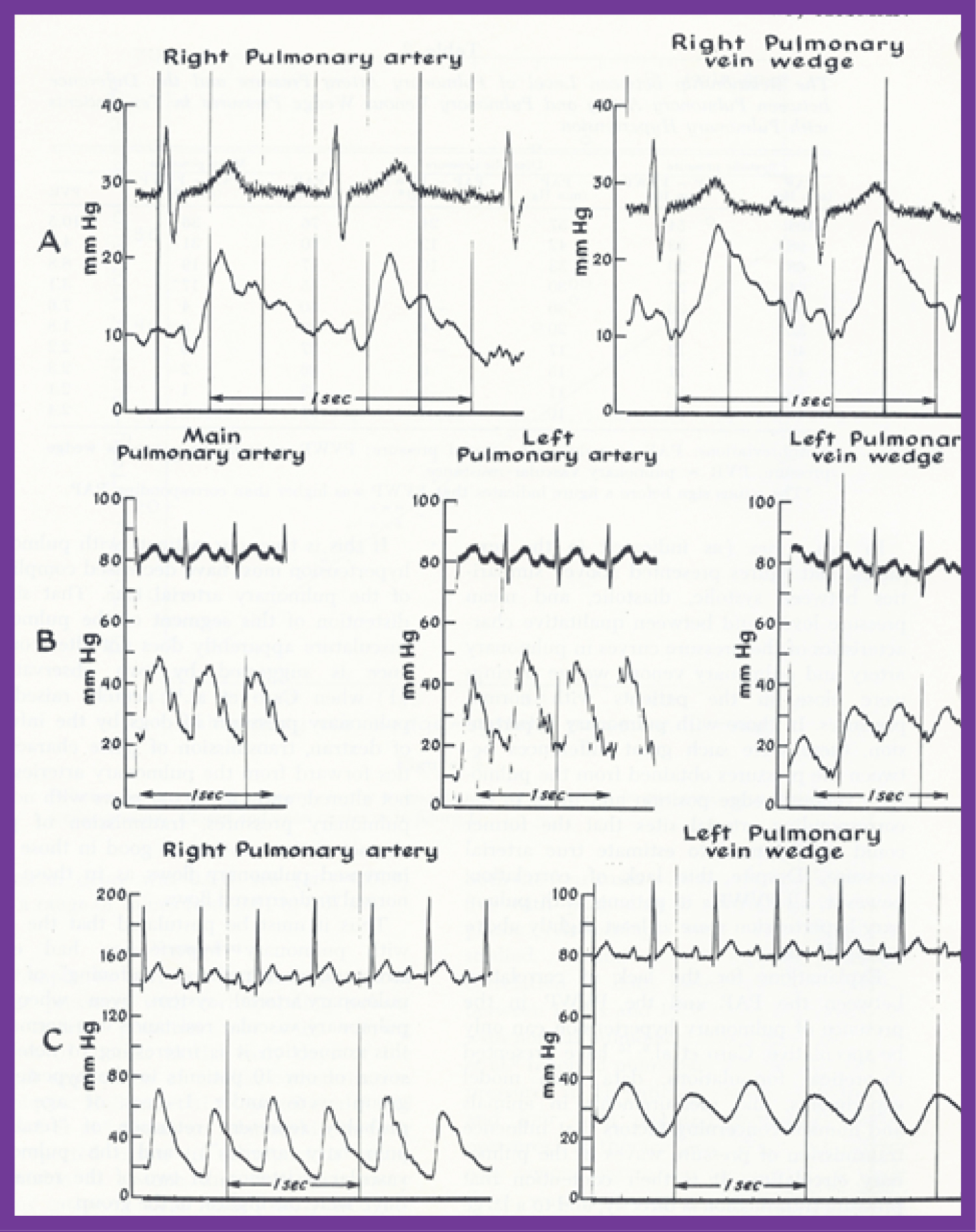 Figure 11: This figure shows examples of pulmonary venous (PV) wedge and the corresponding pulmonary arterial (PA) pressure tracings. Note the similarity of the tracings in patients with normal PA pressures (A and B). In a patient with elevated PA pressure the PV wedge pressures is mildly damped with slightly lower magnitude when compared with the PA pressure (C). The pulse pressure is also lower in the PV wedge position. Note that both the PA and PV wedge pressure tracings demonstrate pulsus alternans in a patient with congestive heart failure (C) [55].