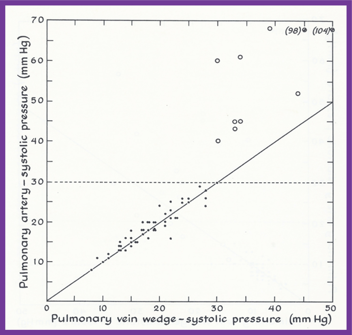 Figure 12: This figure demonstrates the relationship of the pulmonary artery (PA) with the pulmonary venous (PV) wedge systolic pressures. Patients with normal pressures (i.e., less than 30 mmHg) are shown as closed circles while those with systolic pulmonary hypertension are shown as open circles. Note the close-to-identical PA and PV wedge systolic pressures in patients with normal PA pressures, and the lack of such a relationship in patients with elevated PA pressures. The dashed line across at 30 mmHg represents the upper limits of normal PA pressure. The graphs plotting the diastolic and mean pressures show similar findings; the interested reader is referred to the original publication (Figure 2 and Figure 3) for review [55].