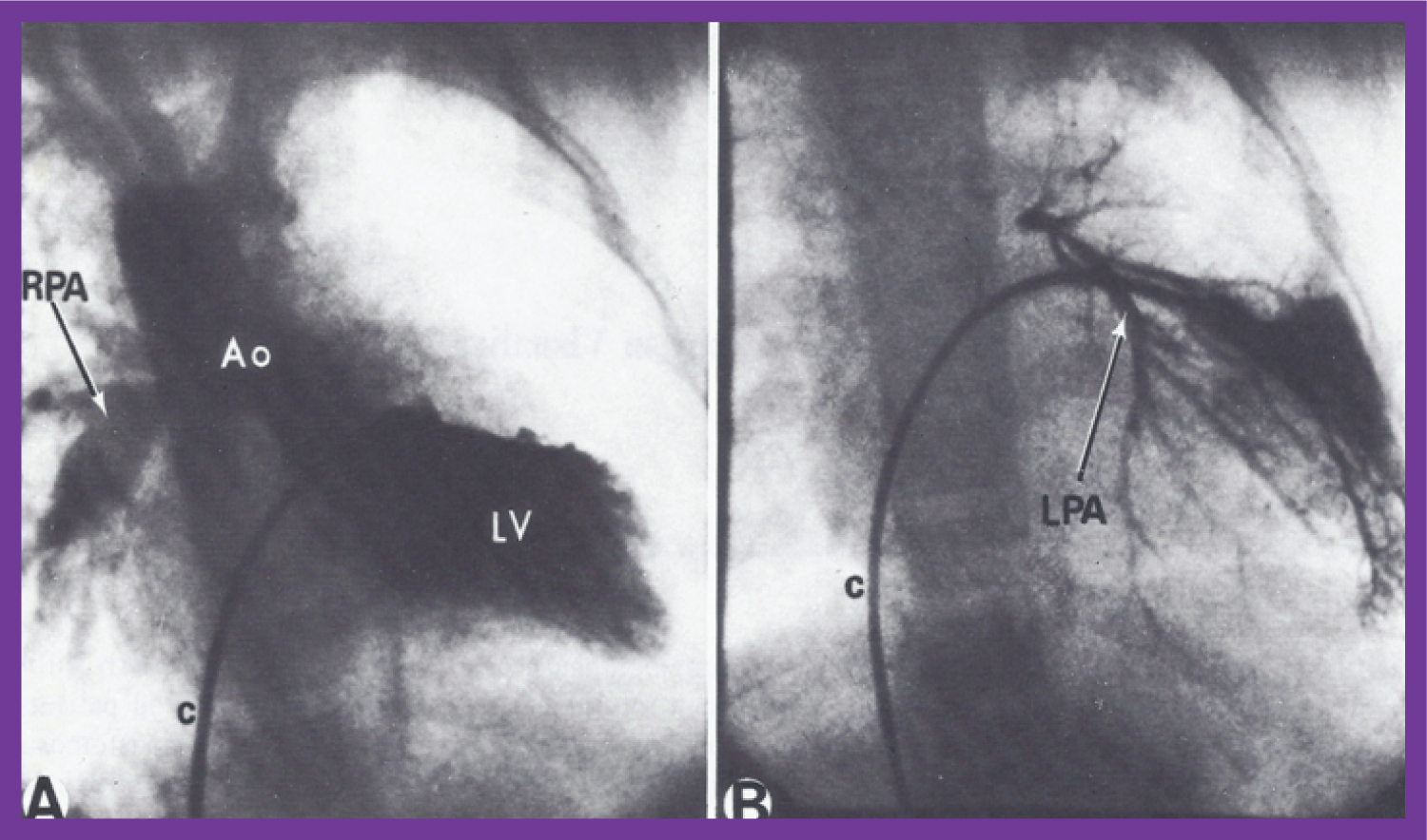 Figure 13: A) Selected frame of a left ventricular (LV) cineangiogram in postero-anterior view, demonstrating the opacification of the aorta (Ao) with a visualization of the right pulmonary artery (RPA) without the opacification of the left pulmonary artery (LPA). The catheter (c) is positioned in the LV via the patent foramen ovale and left atrium (not marked); B) Selected frame of a pulmonary venous wedge cineangiogram, clearly demonstrating the size of the LPA. The catheter is positioned in the pulmonary venous wedge position via the patent foramen ovale and left atrium (not marked) [62].