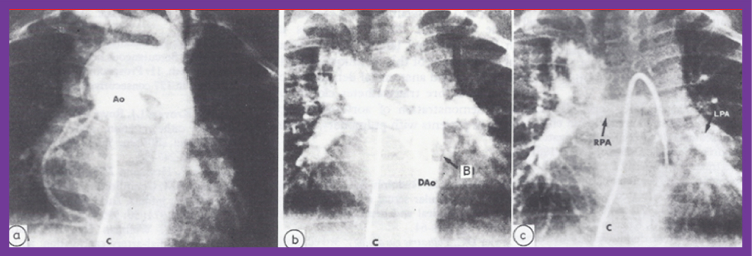 Figure 14: a) Selected frame of an aortic (Ao) root cineangiogram in postero-anterior view, three days after Waterston shunt surgery, demonstrating the prompt opacification of both branch pulmonary arteries via the Waterston shunt. The catheter (C) was positioned in the Ao via the umbilical artery; b) Selected frame of a left ventricular (LV) cineangiogram in postero-anterior view at the age of 12 months, demonstrating opacification of the aorta (Ao) with visualization of the right pulmonary artery (RPA) but without opacification of the left pulmonary artery (LPA). The catheter (c) is positioned in the LV via the patent foramen ovale and left atrium (not marked) [63].