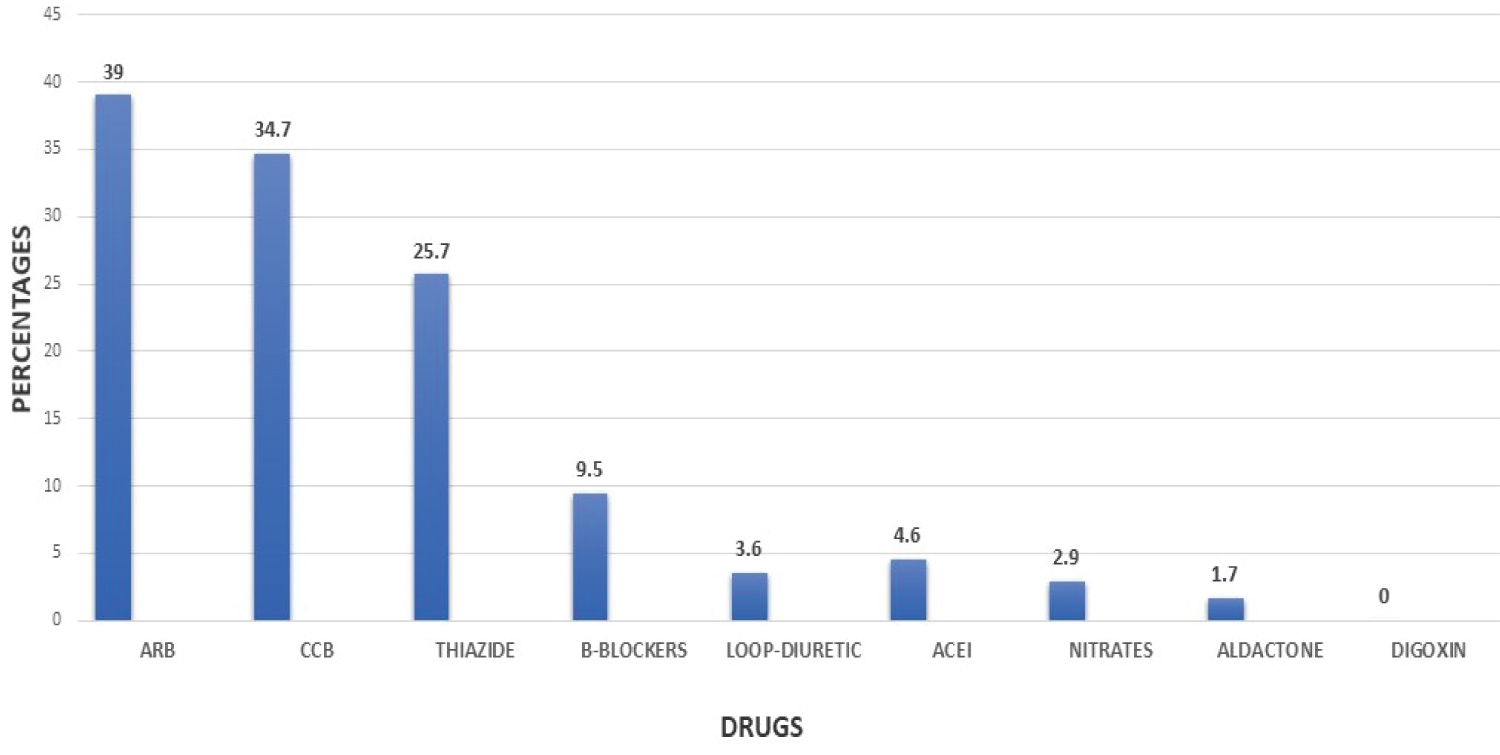 Figure 1 shows the drugs used by study patients, while the symptoms and signs of HF experienced by study patients are shown in Table 2. Antihypertensives receptor blockers were the most used antihypertensive (39%), followed by calcium channel blockers (34.7%), thiazide diuretics (25.7%) and beta blockers (9.5%).