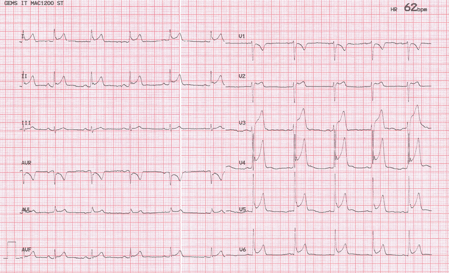 Figure 1: ECG showed moderate concave ST-segment elevation in leads I, II, aVL, aVF and more pronounced ST elevation in leads V4-V6, without reciprocal depression, followed by a positive T waves.