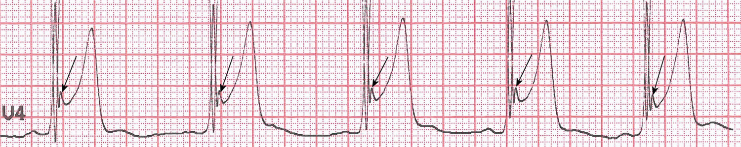Figure 2: The strip demonstrated J-point elevation in lead V4 of 0.2 mV and notch configuration, (arrows).