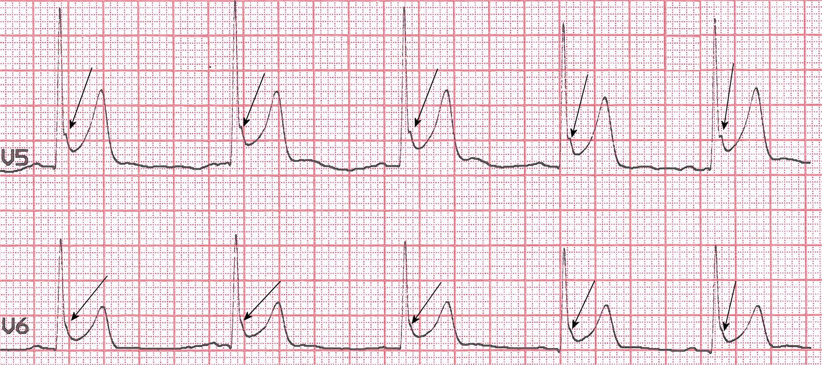 Figure 3: A magnified view of lead V5-V6 revealed J-point elevation with both notch and slur morphology in lead V5, progressing to only slur configuration in lead V6 (arrows).