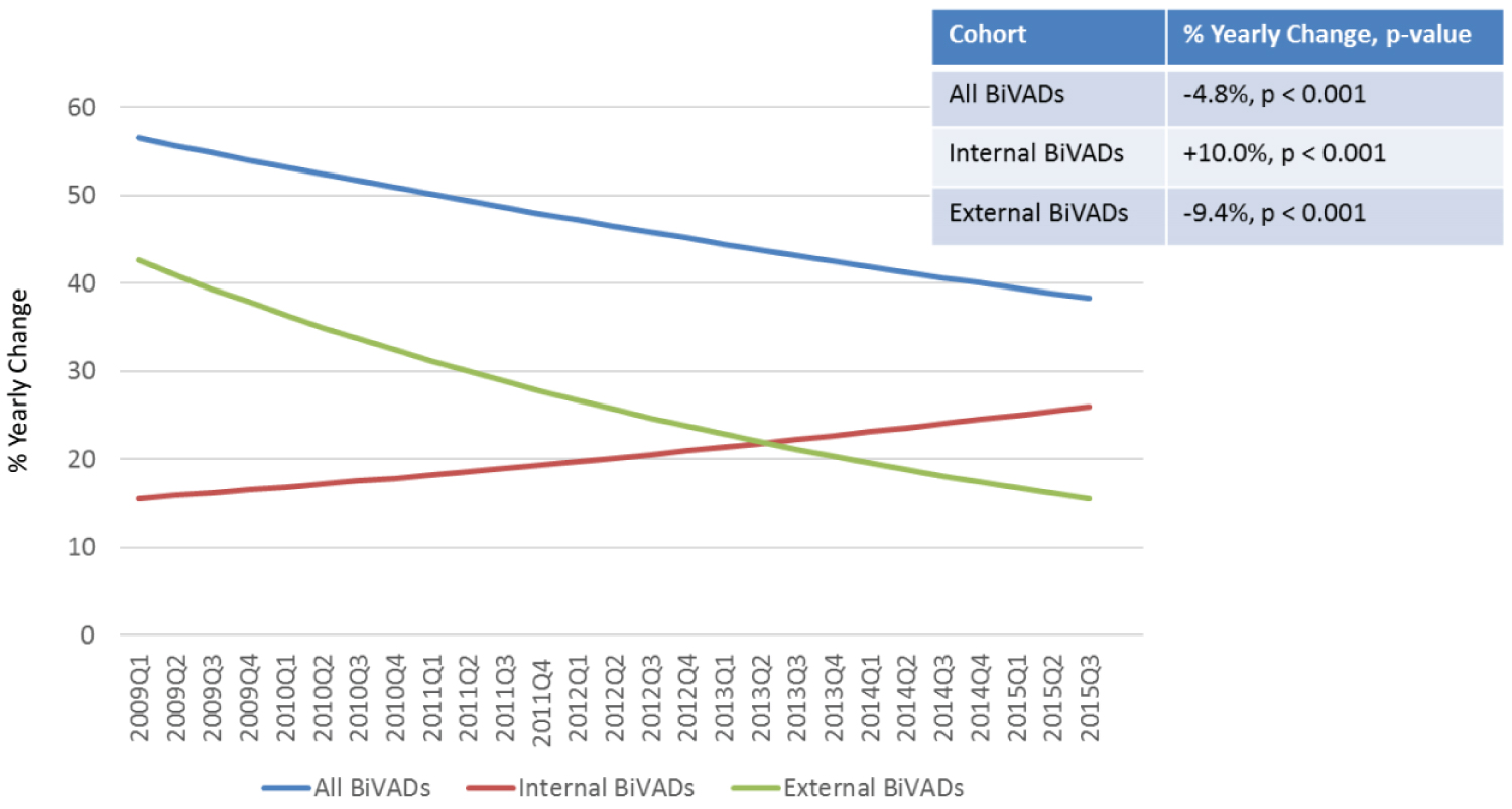 This is a retrospective analysis of the National Inpatient Sample (NIS) database for internal BiVADs (n = 538) and external BiVADs (n = 727) from 2009 to 2015.