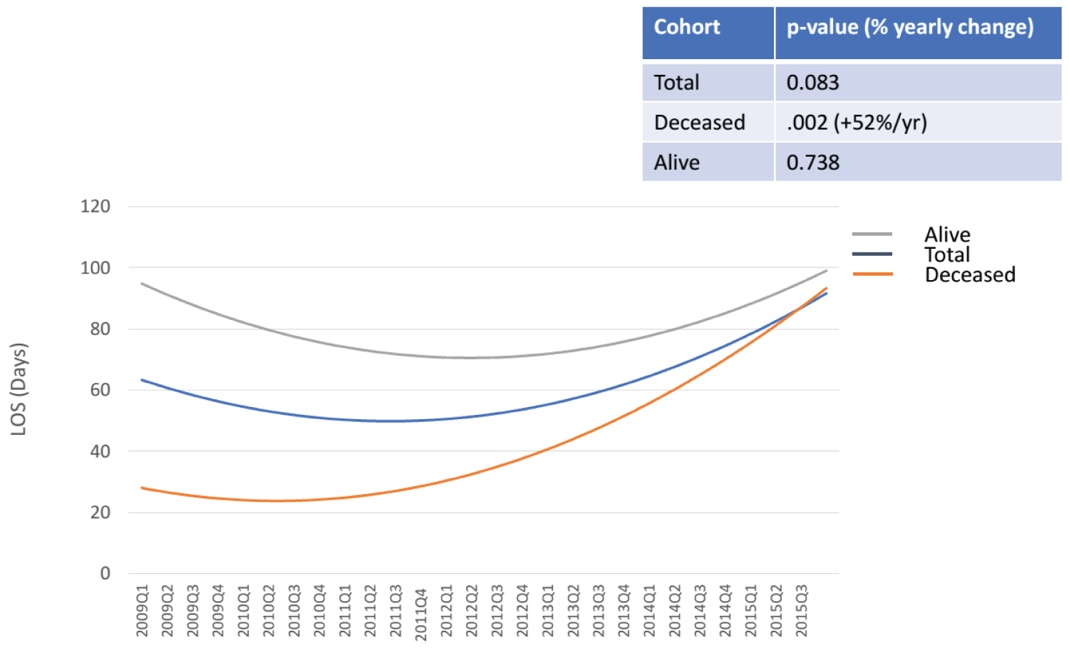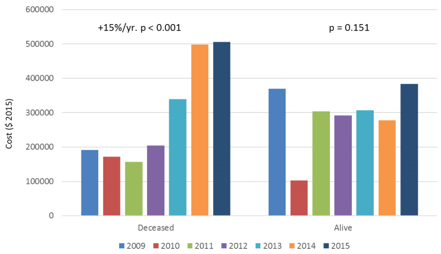 To explain the increase in cost and LOS among BiVAD patients despite no changes in mortality, an exploratory time trend analysis was performed. Stratification based on internal vs. external BiVADs demonstrated no significant time trends in cost and LOS. Stratification based on survival of the index hospitalization demonstrated no significant time trend in LOS or cost among those that survived, however, there was a significant and sizeable increase in LOS (+52.0% per year, p = 0.002, Figure 2), as well as in cost (+15% per year, p < 0.001, Figure 3) among those that died. Even after controlling for known complications and comorbidities outlined in Supplemental Table 1, LOS (+3.8% per year, p = 0.025) and cost (+$33,736 per year, p = 0.002) increased significantly among the patients who died during their hospitalization. These results suggest that the increase in cost and LOS associated with all BiVAD scould be attributed to the substantial increase in these parameters among patients who do not survive the index hospitalization.