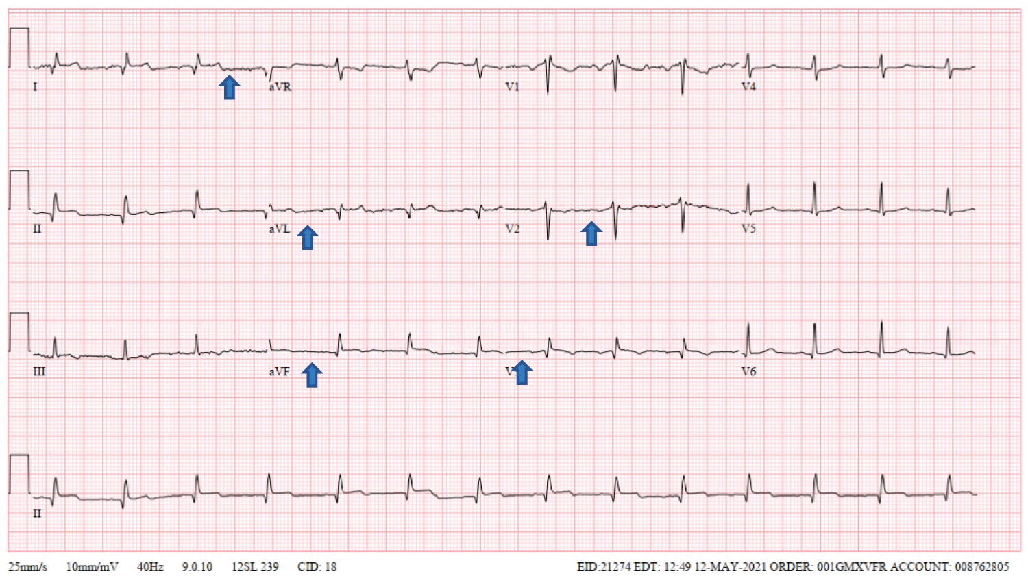 Initial labs revealed a significant elevation in Troponin to 15.4 ng/mL (normal range < 0.03 ng/mL). D-dimer was < 0.27 ug/ml Fibrinogen Equivalent Unit (FEU), normal range < 0.50 ug/mL FEU). A computed tomography angiography of his pulmonary arteries with intravenous contrast was performed that showed no evidence of pulmonary emboli, aortopathy or acute pulmonary pathology but revealed lymphadenopathy; which was presumed to be secondary to inflammatory mediated. White blood cells (WBC) were 7 (thousand per cubic milliliter) K/uL (normal range: 4.5-10.3 K/uL). Erythrocyte sedimentation rate (ESR) was 11 (millimeters per hour) mm/hr (normal range 0-15 mm/hr). C-reactive protein (CRP) was 40.86 (milligrams per liter) mg/L (normal range: < 5.1 mg/L). Repeat Troponin trended upwards and peaked at 22.3 ng/ml. Initial electrocardiogram (ECG) is listed in Figure 1. A repeat ECG revealed ST segment elevation in the inferior-lateral leads, Figure 2. Chest X-ray was without significant findings.