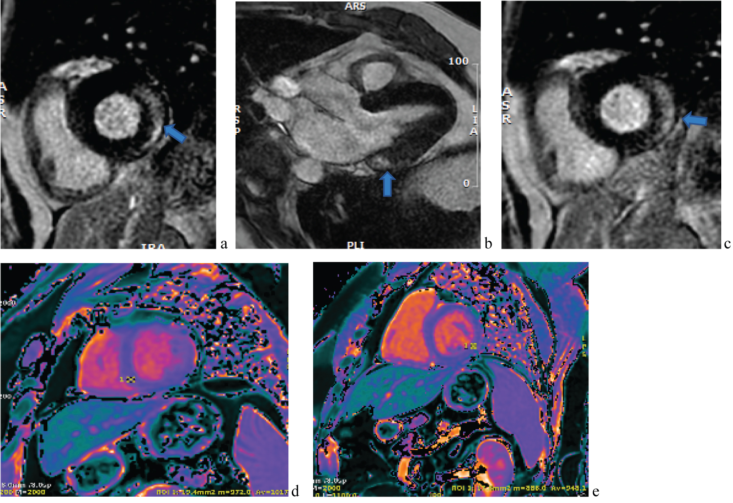 Figure 3: (a-e) First CMR scan with mid to epicardial lateral wall fibrosis (in white) with LGE (arrows) on gradient echo images and T1 maps (normal).