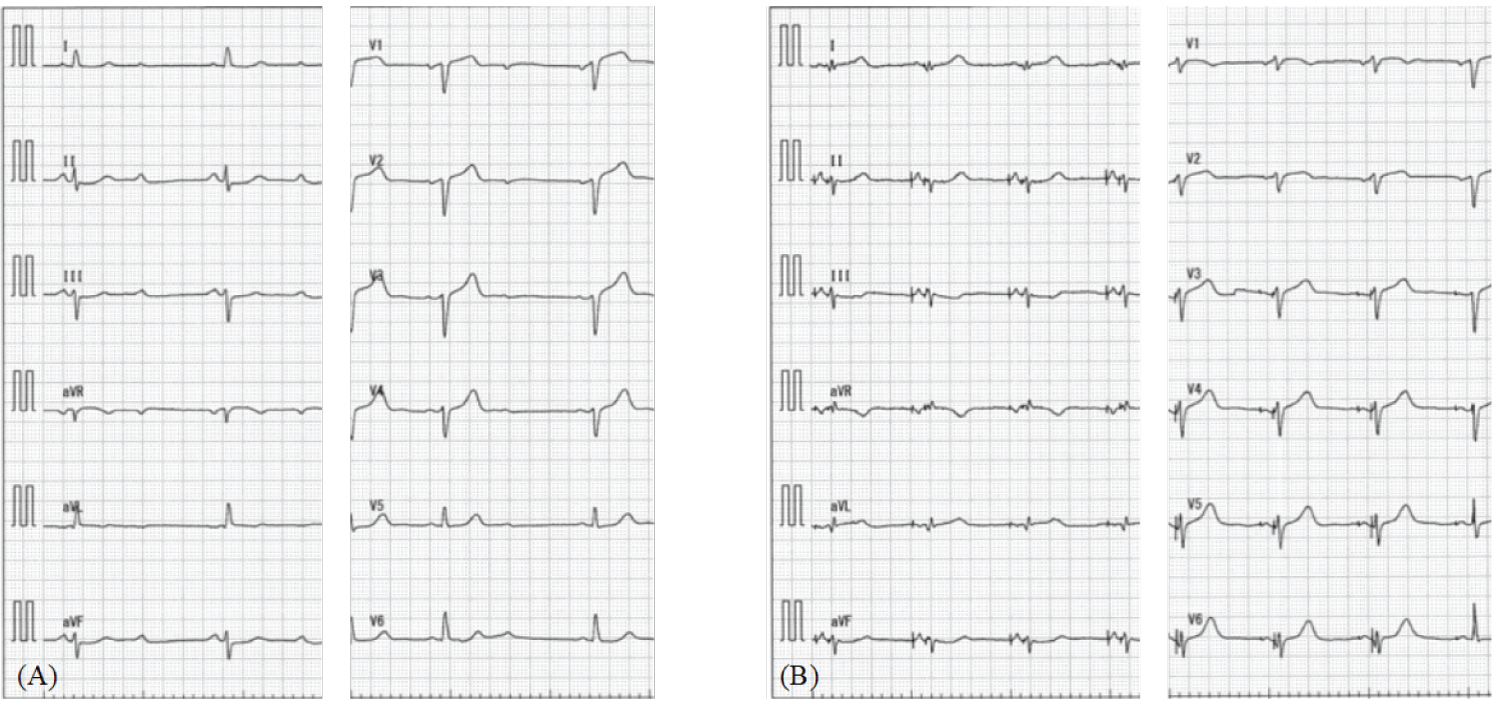 Figure 2: A) Electrocardiogram (ECG) showed advanced atrioventricular block; B) Post implantation ECG showed QRS duration of 104 ms.