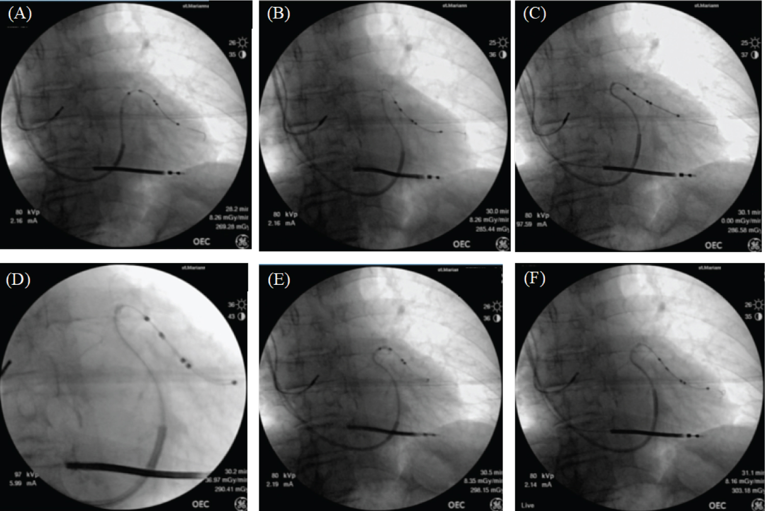 The patient was a CRT-adapted patient and further CRT was performed upon admission. The leads were punctured in the left subclavian vein after creating a left pocket. The CS was cannulated successfully using a CS guiding catheter (Attain Command™ + SureValve™ integrated valve, Medtronic). After inserting the guide catheter into the CS, venography was performed to confirm the same lateral branch of the CS as in the CT. Using a Runthrough NS 0.014-inch peripheral angioplasty wire (TERUMO, Tokyo, Japan) was difficult. We attempted to advance a 90° microcatheter (Attain Select II™ + SureValve™ sub-selection catheter, Medtronic) along with the ASQ lead; however, the microcatheter did not advance over the lateral branch owing to venous tortuosity (Figure 4A, Figure 4B and Figure 4C). We applied a technique using active fixed LV leads, which has already been reported as an anchoring technique [3]. The ASQ lead screw was in the distal segment of the lateral branch (Figure 4D). Next, we attempted to advance a microcatheter by pulling the ASQ lead, and the microcatheter was advanced over the tortuous lateral branch (Figure 4E). Because the ASQ leads are fixed, they do not shift when the ASQ leads are pulled. The ASQ lead was screwed out and led to passing the tortuous lateral branch, and the ASQ lead was finally implanted through it (Figure 4F). Good pacing parameters were obtained without phrenic nerve stimulation. We successfully placed the right ventricular (RV) lead (Sprint Quattro 6935M-55, Medtronic) at the apex of the RV and the right atrial (RA) lead (CapSure Sense 4574-45, Medtronic) in the RA appendage. We connected all leads to the generator (Cobalt XT HF Quad, Medtronic) and closed the pocket. The electrocardiogram after implantation had QRS duration of 104 ms (Figure 2B). Patient follow-up at 6 months postoperatively showed NYHA class 2 with an improvement in EF of 35%, and CRT was continued.