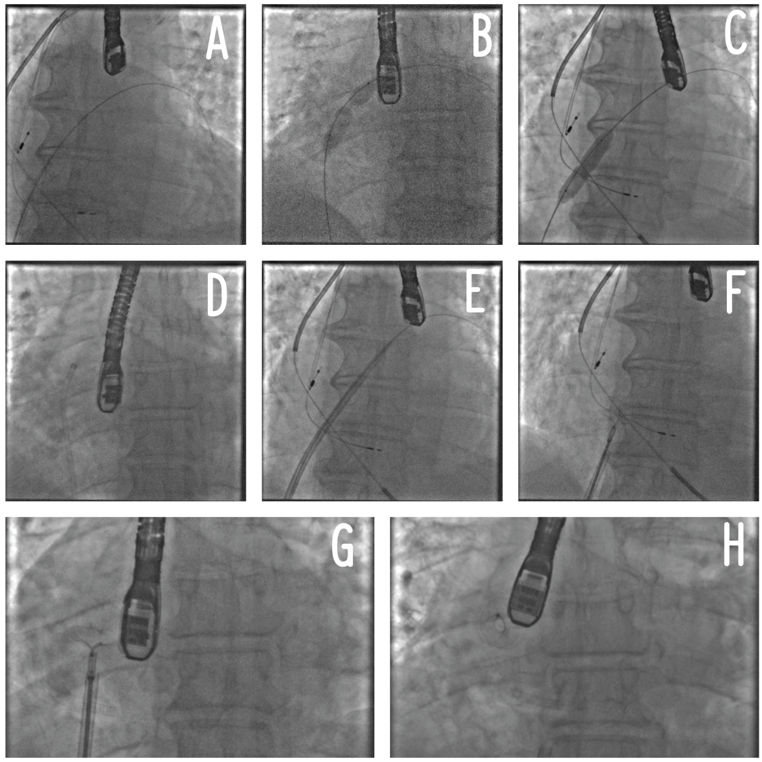 Figure 1: Procedural steps of AFR implantation. Panel A: positioning of a stiff wire in the left superior pulmonary vein; Panel B: atrial septostomy and septal dilatation (part 1); Panel C: septal dilatation (part 2); Panel D: crossing of the AFR delivery system through the septostomy inside the left atrium; Panel E: Advancement of the AFR delivery system inside the left atrium; Panel F: AFR initial release; Panel G: AFR traction test before complete release; Panel H: AFR complete release. AFR: Atrial Flow Regulator.