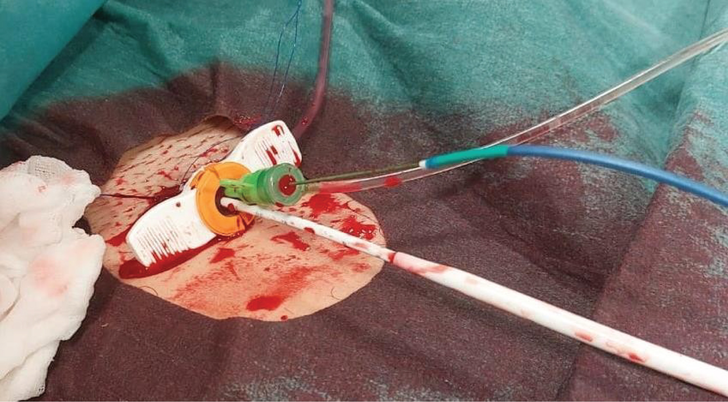 Figure 1: Single-access technique. The Impella 14 F sheath was advanced into the right common femoral artery. Two catheters were introduced into the 14F sheath: a) The Impella CP catheter (white catheter) and b) a 6F sheath (green) through which perform coronary angiography and percutaneous coronary intervention.