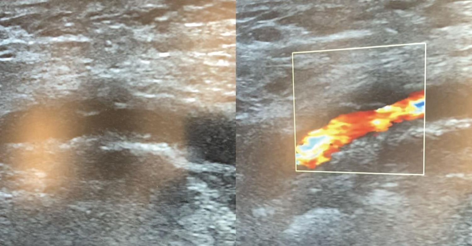 Figure 2: Ultrasound examination. Effective sealing of the access site in the right common femoral artery assessed by two-dimensional and Color-Doppler examination.