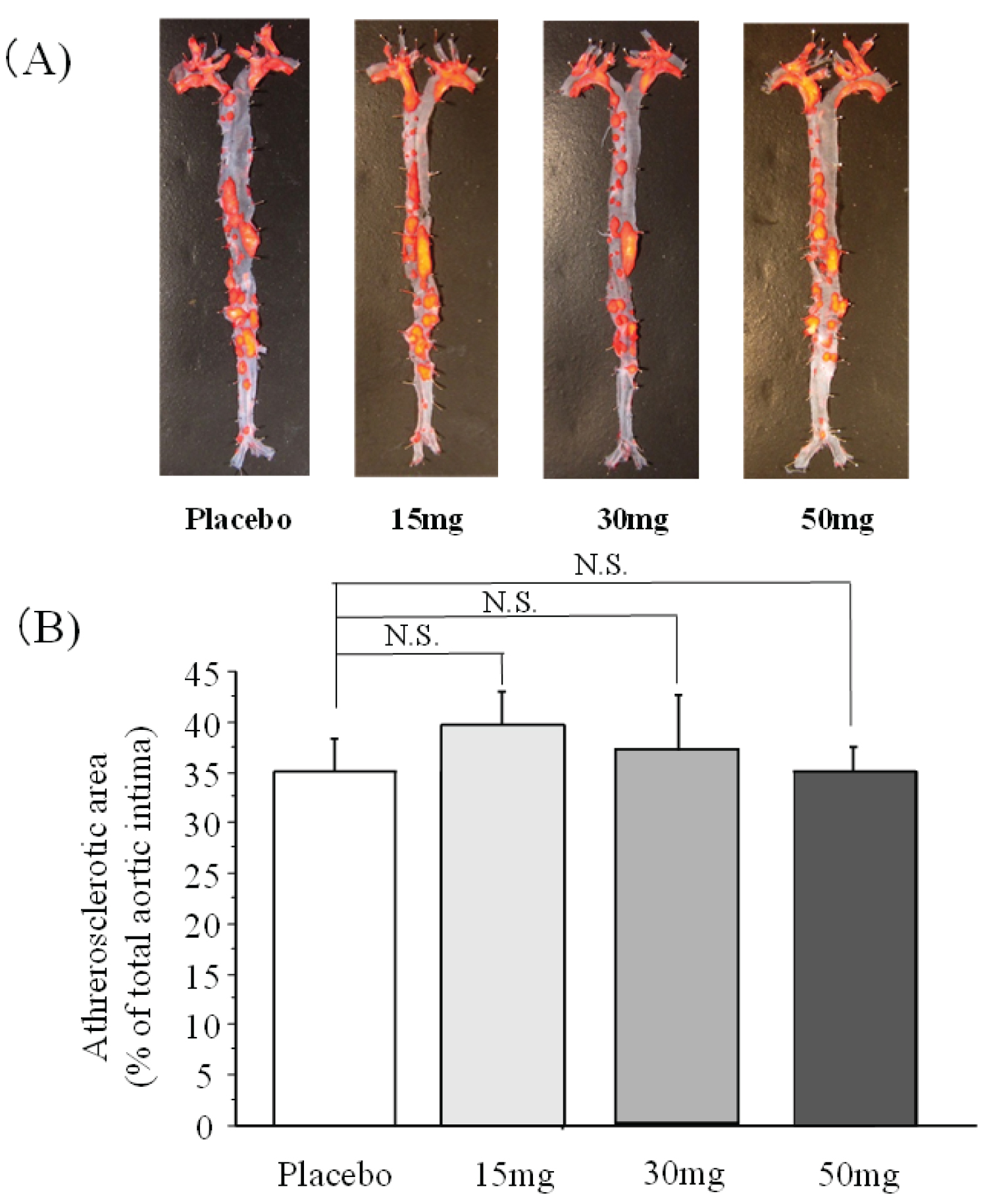 Staining of atherosclerotic areas: The entire aorta method [11] was used to measure development of atherosclerosis. Anesthetized mice were subjected to transcardial perfusion with PBS and 10% neutral buffered formalin, and the entire aorta was removed. The vessel lumen was inverted by means of a longitudinal incision, and the vessels were spread open over a black rubber sheet and held in place using 0.15 mm diameter stainless steel pins. The pinned vessels were stored in 10% neutral buffered formalin fixative until staining. For staining, specimens were washed with distilled water for 30 seconds, immersed in 60% isopropyl alcohol for 1 minute, and then immersed in Oil Red O (Sigma-Aldrich Chemie GmbH, Schnelldorf, Germany) pre-warmed for 15 minutes at 37 °C. Following staining, the specimens were immersed in 60% isopropyl alcohol for 2 minutes and washed with distilled water for 2 to 3 minutes. Analysis of atherosclerotic area: The entire surface area of the extracted blood vessel (W) and the area stained red with Oil Red O (R), which corresponds to the atherosclerotic area, were determined by using image analysis software (Image-Pro Plus; Media Cybernetics, Inc., Rockville, MD, USA). From these two values, we calculated the percentage of the entire blood vessel that was affected by atherosclerosis [(R/W) × 100], and this was defined as the atherosclerotic area.