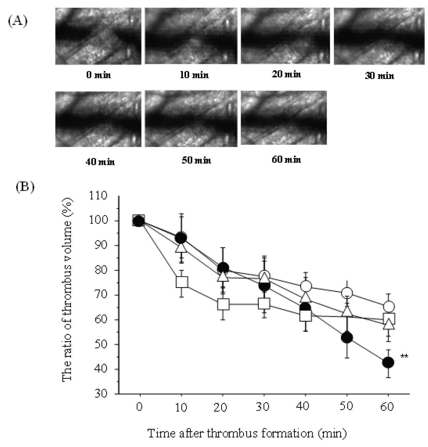 After the stable mural thrombus that stenosed 80% of the vessel lumen had formed, the thrombus was video-recorded for 60 minutes using a DVD recorder (DVR-710H; Pioneer, Tokyo, Japan). The recorded thrombus images at several time points (0, 10, 20, 30, 40, 50, and 60 minutes) were captured on a PC, and the thrombus size was estimated by using Image-Pro Plus image analysis software. The thrombus volume at time of thrombus formation (minute 0) was set as 100%, and the thrombus volume at each subsequent time point (10, 20, 30, 40, 50, and 60 minutes) was calculated as a percentage relative to the initial volume.