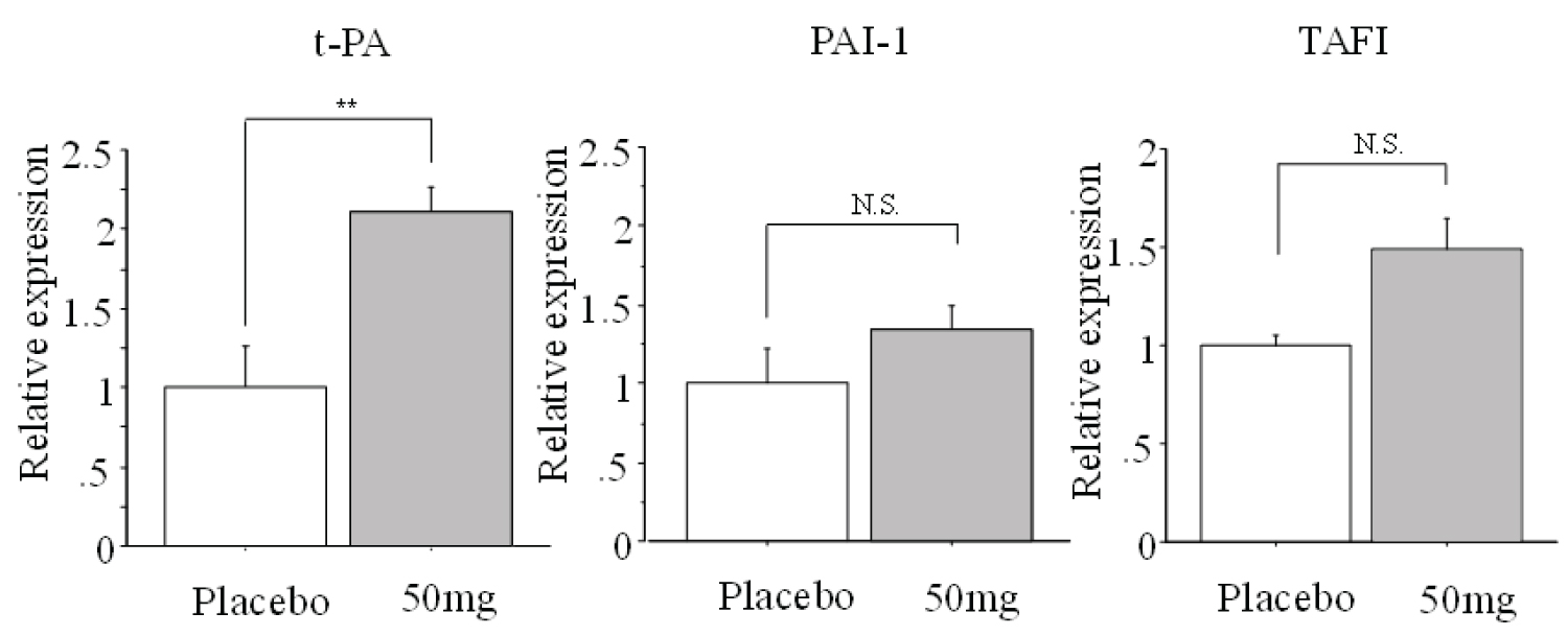 Vascular samples (t-PA, PAI-1), liver samples (TAFI), n = 6 per group, **: P < 0.01 vs. placebo group.