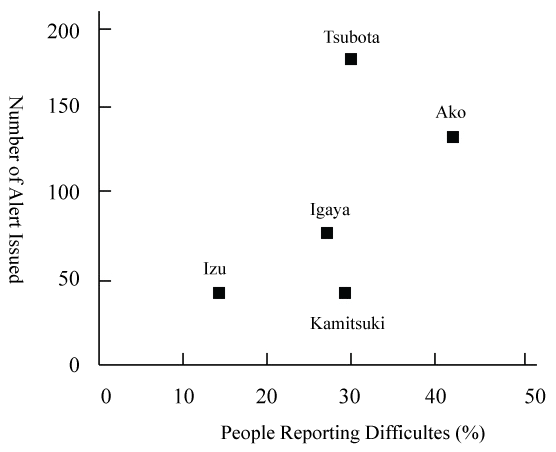 The government issued alerts based on the results of monitoring data. The criteria used for these alerts are shown in Table 2. From February 2005 to June 2005, over 100 volcanic alerts were issued in the Ako (130 times) and Tsubota (176 times) areas, as shown in Figure 2. Compared to those areas, there were about one fourth the number of notices and alerts in Izu (45 times) and Kamitsuki (45 times). Ako and Tsubota were likely to be leeward in prevailing volcanic gases, which caused elevated SO2 levels in both areas. In analyzing ratio of symptom from each area, 41.9% of Ako and 30.2% of Tsubota inhabitants had some symptoms attributed to exposure to volcanic gas, however fewer people had symptoms in other areas.