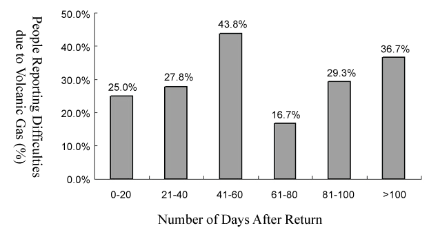 The survey asked patients if they had symptoms that they believe to be attributed to volcanic gas. A comparatively few people (25%) attributed their symptoms to volcanic gas immediately after returning. By days 41 to 60, we found that 43.8% of people reported some symptoms, the highest in the study, which then decreased. However even after 100 days, 36.7% of inhabitants still had some symptoms as shown in Figure 3a. While just after returning to the island, more than half the people (53.8%) reported insomnia, the ratio of people with insomnia decreased to 30.8% by 100 days after their return, as shown in Figure 3b.