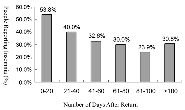 Figure 3B: The percentage of people surveyed who reported insomnia is shown compared to the number of days after return to the island. View Figure 3B