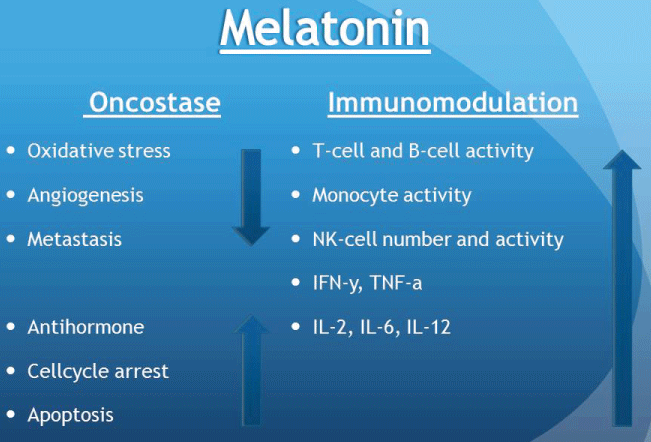 Melatonin has been shown to play a fundamental part in neuro immune modulation. Besides regulating the circadian rhythm it works as a natural antioxidant with immune stimulatory and anti-cancer properties. Melatonin is a regulator of hemopoiesis and modifies various cells and cytokines of the immune system. Melatonin elicits oncostatic properties in a variety of different tumor cells. A number of studies have documented that melatonin, given in combination with chemotherapy to patients with disseminated disease, increases the overall survival and reduces toxic side effects.