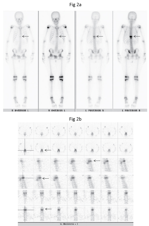 Figure 2: Tc99m-MDP (a) Delayed planar anterior and posterior and (b) SPECT bone scintiscans show intense focal tracer uptake in the T9 vertebral body and posterior elements (arrows). There was no other area of abnormal uptake in the rest of the skeleton.