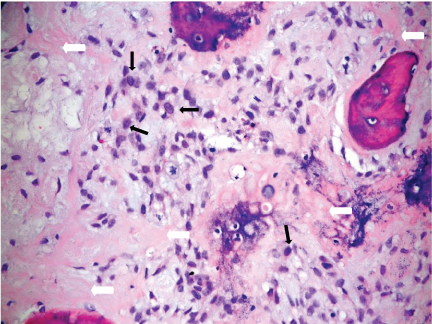 Figure 4: Photomicrograph of the T9 vertebral biopsy specimen shows atypical spindle cells (thin black arrows) producing osteoid (thick white arrows) with permeation into marrow spaces. Consistent with high-grade osteosarcoma (Haematoxylin & eosin, x200).