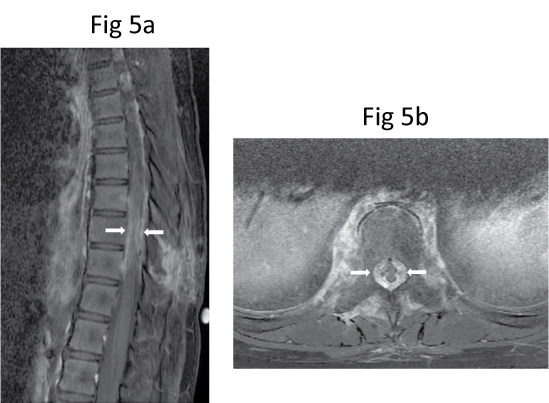 Figure 5: Repeat (a) Sagittal and (b) Axial post-contrast fat-saturated T1-W MR images show further progression of the soft tissue component, resulting in more severe compression of the spinal cord (arrows).