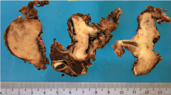 Figure 7: Photographs of the resected T9 corpectomy specimen show a white-grey appearance with firm consistency. The high-grade osteosarcoma was histologically similar to the previous biopsy specimen.