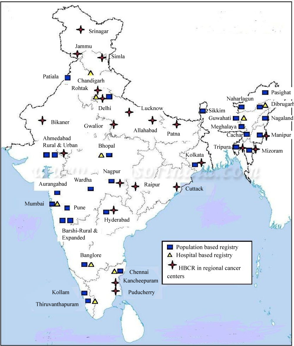 Figure 1: Showing the distribution of population based and hospital based cancer registries in India; HBCR at AHRCC Cuttack was set up in 2016. View Figure 1