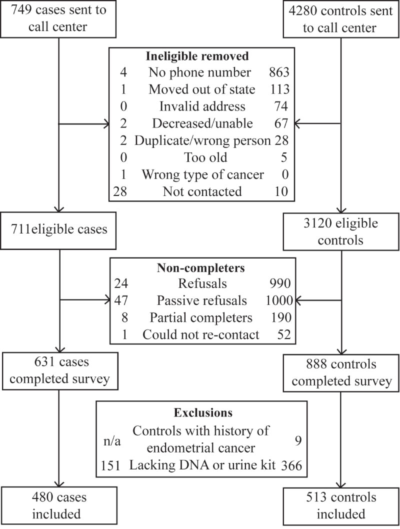 Sample derivation has previously been described [7] and is summarized in Figure 1. Briefly, of the 1519 women who completed the telephone survey, 517 failed to return analyzable saliva samples. We excluded nine controls that reported a history of endometrial cancer, leaving 480 cases and 513 controls in the study.