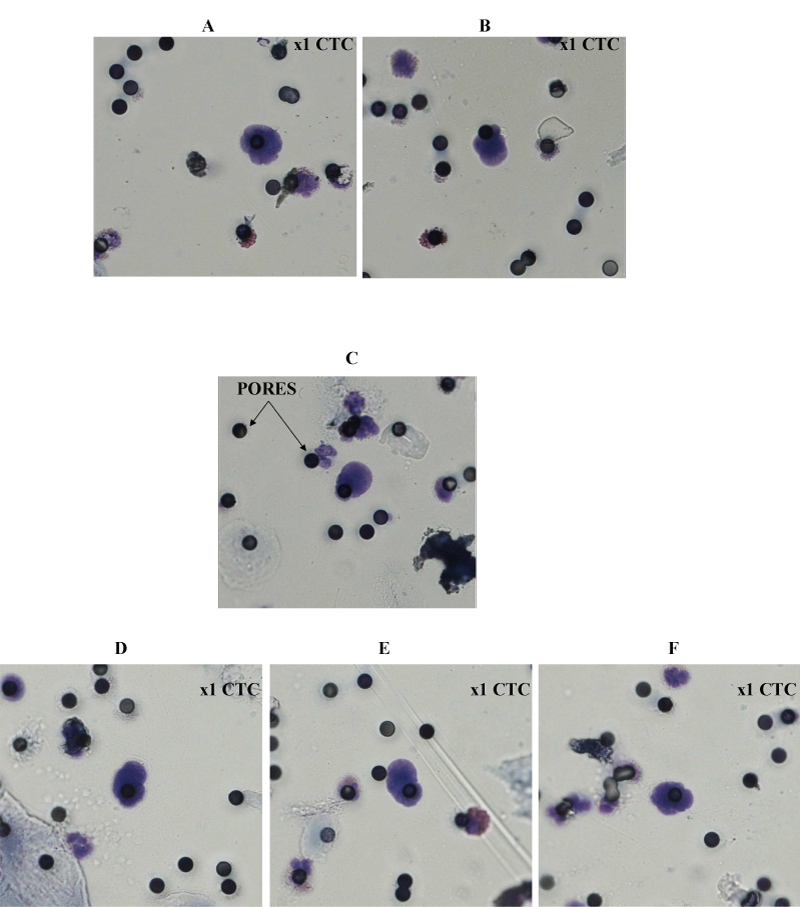 CTCs microscopy analysis: CTCs isolated on the filter of the device were stained with May-Grunwald-Giemsa (MGG) in x40 microscope field of analysis. The filters were then mounted on a glass slide with Faramount mounting Medium (S3025, Dakocytomation, Glostrup, Denmark) and a circular glass coverslip. Under microscopy CTCs have nuclear size greater than or equal to 20 μm, a high and clear nucleocytoplasmic ratio (≥ 0.75), a dense, hyperchromatic nucleus, but not totally opaque and irregular nuclear membrane. Moreover, CTCs showing peripheral cytoplasmic vacuolisation with perinuclear clear space due to a minimal cytoplasmic retraction. Single CTCs may be encircled or infiltrated by platelets (tumoral microembol), by apoptotic cells during chemotherapy, by circulating giant macrophages with differential nuclei morphology and by cluster or solitary endothelial cells with nucleocytoplasmic ratio lower than that of CTCs leading to difficulties in differential diagnosis using CTCs. Cells enumeration was performed using a NIKON eclipse 50i fluorescence microscope integrated with CCD camera system and imaging software (NIKON, France) [15].