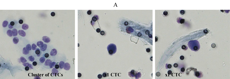 Figure 2: Representative microscopic images (A) of cluster of CTCs and 2 single CTCs from patient 3 (CRC).