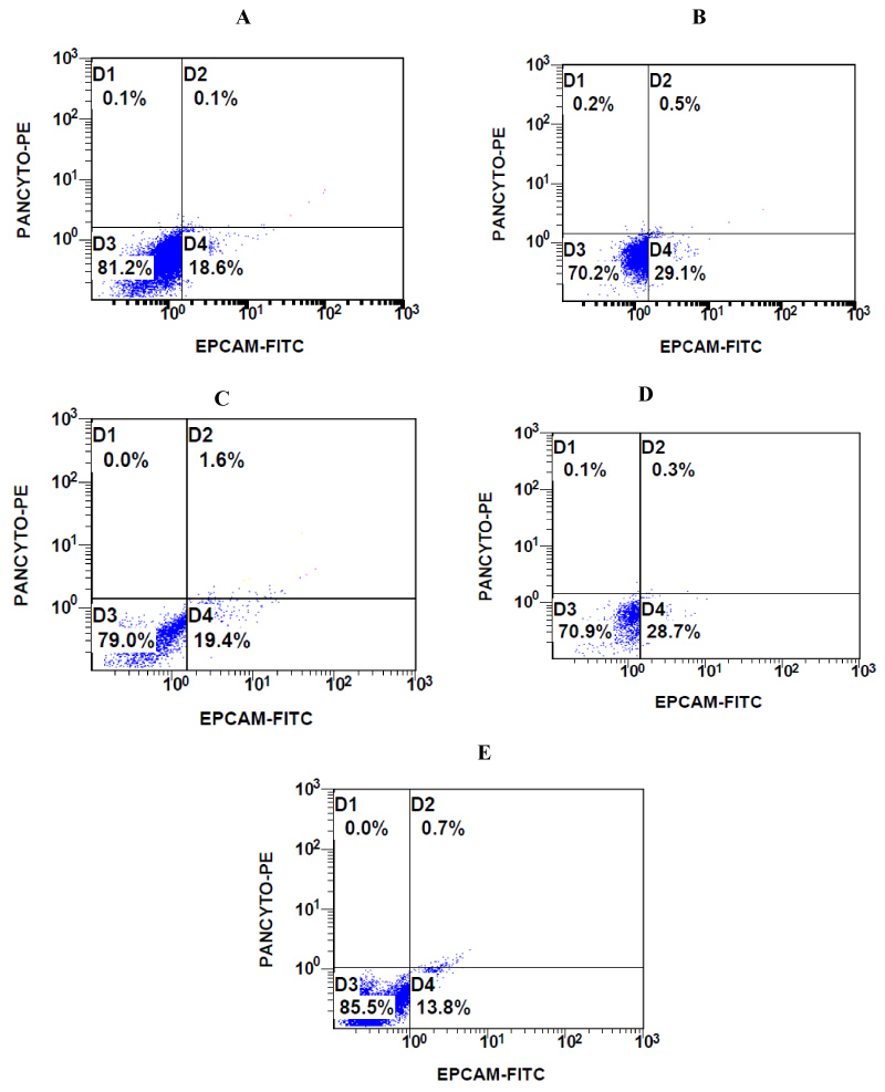 Figure 3: Representative flow cytometric images of CTCs from A) Patient 1 (OC); B) Patient 2 (BC); C) Patient 3 (CRC); D) Patient 4 (TNBC); and E) Patient 5 (UC) with CD45-EPCAM + PANCYTO + immunophenotype, gate D2 (see Materials and Methods).