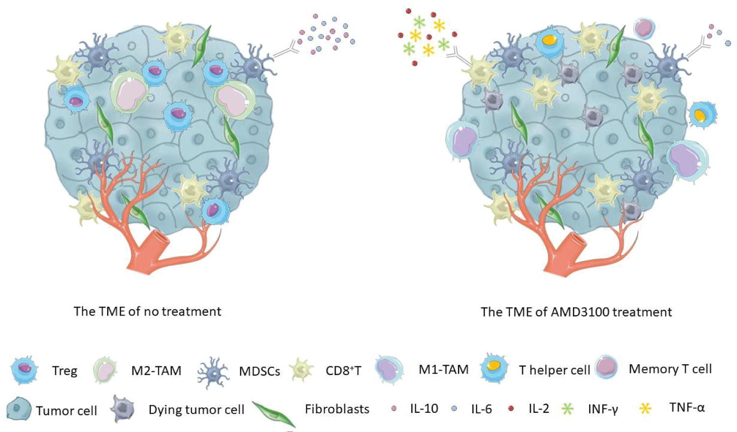 The application of AMD3100 in cancer treatment has not been well characterized, particularly in AMD3100-mediated immune modulation. While effector T cells execute antitumor activities and eliminate tumor cells, immunosuppressive cells participate in tumor immune escape through various mechanisms. In-depth study of immune cells in the TME can provide useful diagnosis, prediction and prognostic information. The research of AMD3100 on the regulation of immune cells has profound significance and lays a solid foundation for future research and treatment, highlighting AMD3100 working synergistically with other therapeutics to enhance the antitumor efficacy.