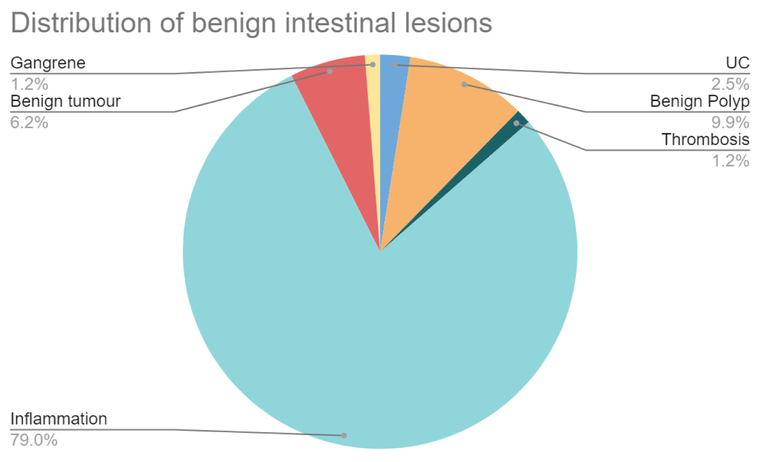 In the Benign group, the maximum cases (79.01%) were of inflammatory changes in the intestinal wall Figure 4.