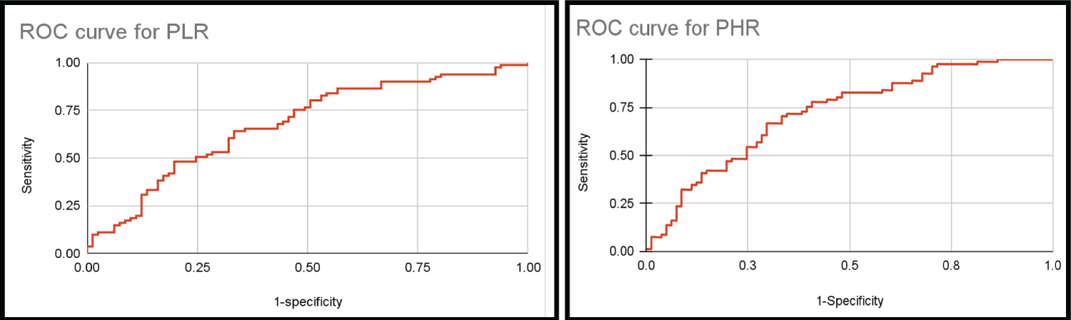 The sensitivity of all three ratios combined was 48 and specificity was 37. Cut-off values for PLR, PHR, MPV/Pc were considered to be 175, 3 and 0.024 respectively. The sensitivity of all three ratios combined was 48 and specificity was 37. ROC shows AUC of 0.679, 0.723, 0.731 for PLR, PHR an MPV/Pc respectively Table 4, Figure 6.