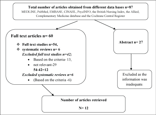 Databases including MEDLINE, PubMed, EMBASE, CINAHL, PsycINFO, the British Nursing Index, the Allied and Complementary Medicine database and the Cochrane Central Register were searched over time period 2000-2015 for quantitative studies with the implementation of psycho-social interventions on postpartum depression cases. The search strategy matched the following criteria: (1) Studies describing postpartum depression, (2) Studies presenting interventions for reducing the severity of postpartum depression, (3) Literature published from the year 2000 and (4) Literature published in English. Exclusion criteria included: (1) Studies with inadequate information on the research methodology, (2) Qualitative and mixed method studies; (3) Studies related to effectiveness of interventions in other postpartum mental illness and (4) Studies showing effectiveness of pharmacotherapy alone in postpartum depression. The selection process is illustrated in Figure 1.