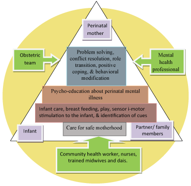From the current review finding, the researcher tried to make a model for caring the perinatal mothers with mental illness. The model ensures integrated approach by including obstetrician, mental health professional, and community health worker/nurses/trained midwives or dais which focuses on care consists of mother-infant- and family member (Figure 2).