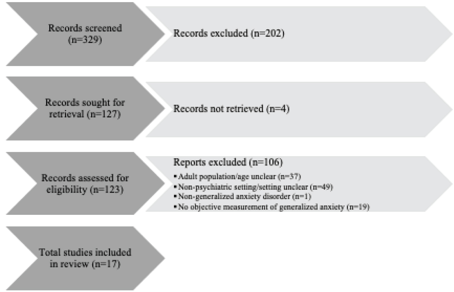 A total of 17 studies were included (Table 1), a handful of which had were in older adolescents or included a predominance of adults. The majority of studies that were included utilized diverse rating scales for the measurement of generalized anxiety, indicating a lack of consensus as to which objective rating scales may be most ideal for evaluation of generalized anxiety in the pediatric psychiatry population. The HAM-A, GAD-7, RCADS, and SCARED were most commonly utilized, with each scale administered in two different study populations. None of the studies that were included utilized the PROMIS. The majority of studies were conducted in Europe, and only four United States-based studies met criteria for inclusion. Most studies were prospective in nature, lending the question as to whether or not anxiety rating scales were implemented for the purpose of the study, rather than as a routine standard of care.