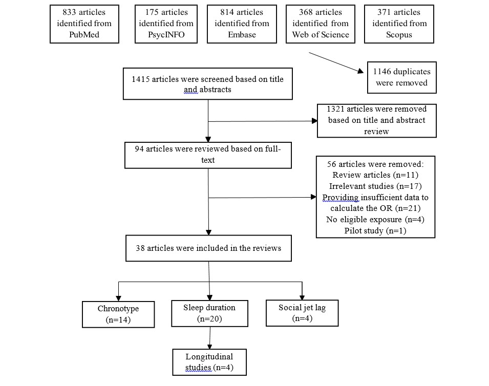 A total of 2,994 records were identified through database searches, with 833 from PubMed, 368 from Web of Science, 814 from Embase, 175 from PsycINFO, and 371 from Scopus. After removing duplicate records, 1,415 records remained. Following the screening of titles and abstracts, 94 full-text articles were retrieved. After reviewing the full-text articles, 11 review articles, 17 irrelevant studies, and 21 studies that did not provide sufficient data to calculate risk estimates were excluded. Additionally, sleep indicators in four studies were divided into two groups, the subjects of two studies were shift workers, and one study was a pilot study. Finally, 38 studies were included in the meta-analysis: four longitudinal studies on sleep duration, 16 cross-sectional studies on sleep duration, 14 cross-sectional studies on chronotype, and four cross-sectional studies on social jet lag. Figure 1 illustrates the flowchart of the article selection process.