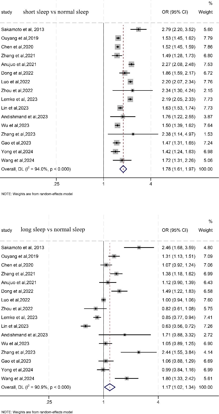 As shown in Figure 2, the cross-sectional study results indicated that both short sleep duration (OR=1.78, 95% CI: 1.61-1.97, I²= 94.0%) and long sleep duration (OR=1.17, 95% CI: 1.02-1.34, I²=90.9%) were associated with an increased risk of depression compared to the normal sleep group. Notably, short sleep duration was more significantly associated with the risk of depression.