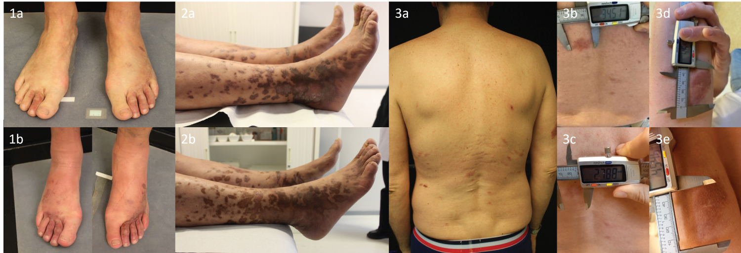 Case 1 at presentation (1a) and after 4 months of topical propranolol (1b). No response was seen. Case 2 at presentation (2a) and after 4 cycles of pegylated liposomal doxorubicin (2b). There was clinical improvement with regression/flattening of multiple lesions and the discomfort in the legs had resolved. Case 3 at presentation (3a overview, 3b back and 3d right upper arm) and after 3 months of topical propranolol (3c back and 3e right upper arm). The lesions showed some improvement.