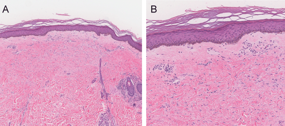 Figure 2: Compact orthokeratosis, loss of the normal rete ridge pattern, papillary dermal edema, and a sparse lymphocytic infiltrate A) H&E, original magnification x4; B) H&E, original magnification x10. View Figure 2