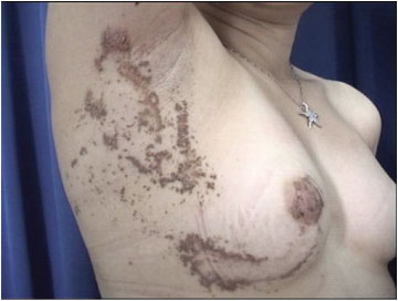 Figure 1: Red-brown hyperkeratotic linear and annular plaques with elevated borders extending from the right mammary to the right axilla along the Blaschko lines. View Figure 1