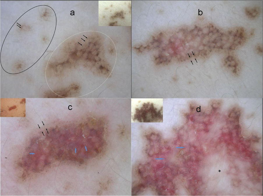 On the other hand, the observation of the variation of the dermoscopic findings according to the age of the lesions and the presence of the gray-brown network-like areas in the central portion of most of the lesions were the distinct features of this case. Furthermore, these gray-brown network-like areas were observed to be replaced by a reddish vascular network in the center with the maturation of the lesions.