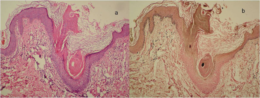 Histopathological examination from the edge of the lesion revealed cornoid lamella formed by parakeratotic keratinocytes together with orthokeratotic hyperkeratosis, absence of the granular layer below the cornoid lamella, focal vacuolar degeneration of the basal layer, an intense lichenoid lymphocytic infiltration in the dermis and aggregates of melanophages on the both sides of cornoid lamella in the superficial dermis. The central portion of the lesion showed multiple cornoid lamellas. Between these cornoid lamellas, the epidermis was atrophic together with dermal fibrosis, increased dilated vascular structures and multiple melanophages. Despite the presence of melanophages in the superficial dermis on the both side of cornoid lamella, there were no melanophages below the cornoid lamellas (Figure 3A). Additionally, immunohistochemical examination with HMB-45 and Masson Fontana silver stain revealed that the number of melanocytes was normal below the cornoid lamella; however there were no melanin pigment accumulation at these sites (Figure 3B).