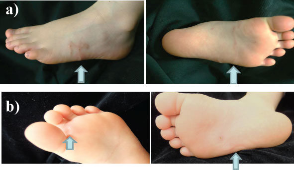 Figure 1: A) Linear red nodules visible on the foot were observed during the first consultation; B) Recurrence of the linear nodule was noticed postoperatively. View Figure 1