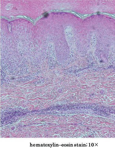 Figure 2: The hematoxylin and eosin (H&E) section of the excised specimen shows spongiosis with band-like eosinophil and neutrophil infiltration in the dermis. View Figure 2