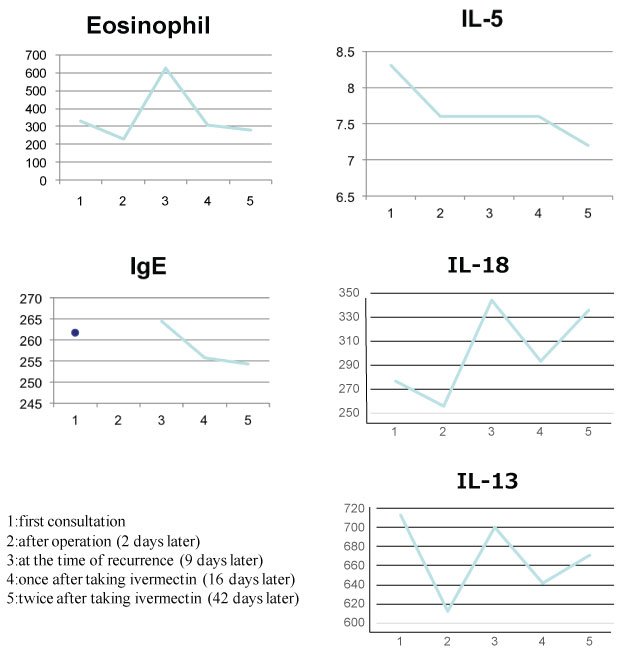 IL-18 cascade-mediated mechanism is involved in host defense against parasitic infections, including that caused by Strongyloides venezuelensis [8,9]. IL-13, a Th2 cytokine, induces IgE and eosinophil production during parasitic infections. IL-18 and IL-13 levels were slightly decreased postoperatively but increased during the recurrence stage. The transition of IL-18 and IL-13 levels revealed the active movement of hookworm and host defense against the parasite. IL-13 and IL-18 production would be more enhanced after second time taking ivermectin. This was probably due to killing whole parasites, resulting in the increase of further inflammation. Eosinophil counts, IL-5, and IgE levels correlated well with the treatment procedure. IL-5 levels reportedly decreased following ivermectin administration [10]. IL-5 level decreased gradually but the IL-18 and IL-13 directly corresponding to the recurrence and treatment. Without the presence of specific pathogen, over production of IL-18 induces Th2 skewing, causing the hyper production of IL-4, IL-5, and IL-13. Although IL-4 and IL-13 share the same receptor subunit, IL-5 dose not. This discordance may influence the different pattern of cytokine fluctuate. Taken together, we described the transition of Th2 cytokines, which were largely involved in HrCLM, in a patient with acquired HrCLM. Furthermore, IL-18, in combination with IL-13, was associated with anthelmintic mechanism.