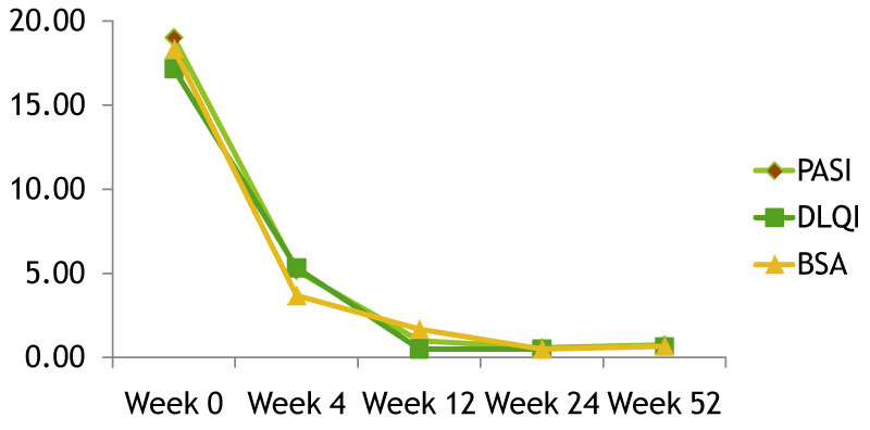 Figure 5: Mean PASI, DLQI, BSA mean score at week 0, 4, 12, 24, 52. View Figure 5